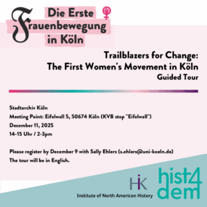 Hist4Dem and the Institute of North American History at University of Cologne invite you to join a guided tour of the Stadtarchiv’s exhibition „Trailblazers for Change: The First Women’s Movement in Köln“ on December 11, 2025, from 2:00 to 3:00 pm. The meeting point will be at Eifelwall 5, 50674 Köln (KVB stop “Eifelwall”). Please register by December 9 with Sally Ehlers at s.ehlers@uni-koeln.de. The tour will be in English.